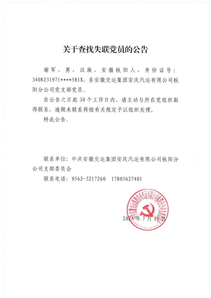 樅陽(yáng)分公司黨支部關(guān)于查找失聯(lián)黨員的公告