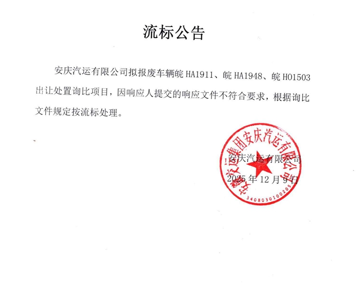 擬報廢公務(wù)車(chē)皖HA1911、皖HA1948、皖HO1503出讓處置流標公告