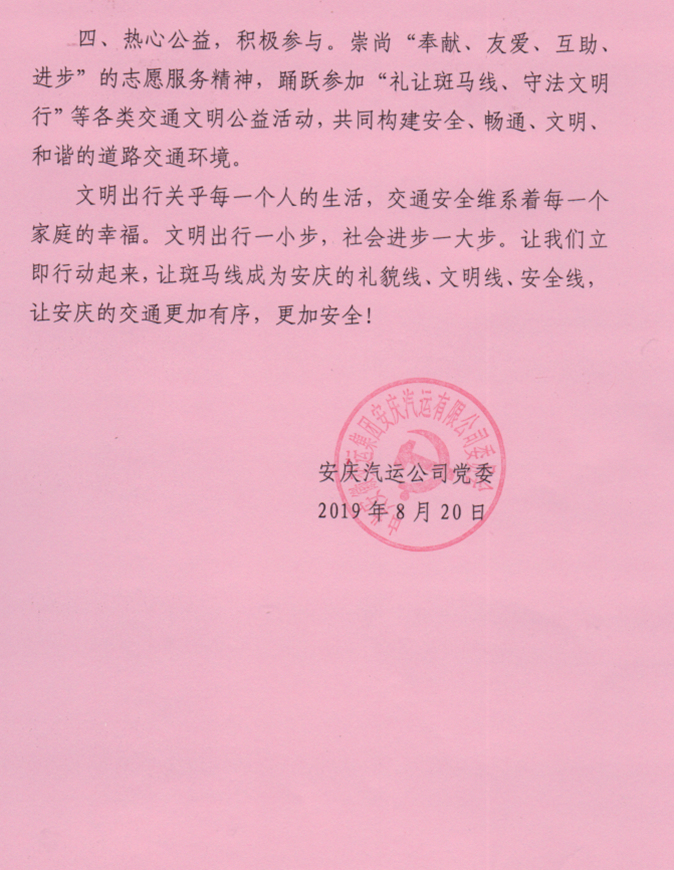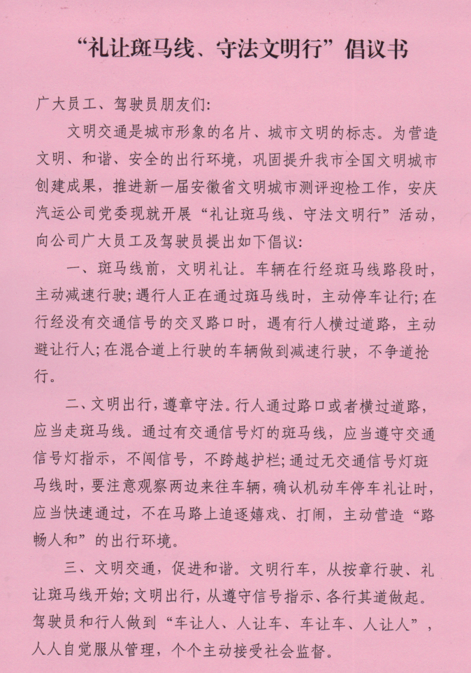 公司黨委開(kāi)展“禮讓斑馬線(xiàn) 守法文明行”活動(dòng)倡議書(shū)