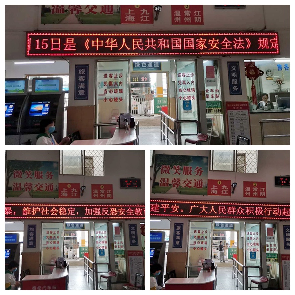 按照上級關(guān)于開(kāi)展平安建設集中宣傳活動(dòng)的文件要求,岳西分公司首先通過(guò)會(huì )議學(xué)習、張貼文件、在QQ群和微信群進(jìn)行信息推送等多種方式對平安建設工作進(jìn)行廣泛宣傳,讓文件精神傳達至每位員工和全體司售人員;其次摘取了《平安建設戶(hù)外廣告、宣傳口號》《基層與行業(yè)平安創(chuàng )建宣傳口號》《掃黑除惡專(zhuān)項斗爭宣傳口號》相關(guān)宣傳內容,自5月11日以來(lái)在車(chē)站站前廣場(chǎng)電子屏上滾動(dòng)播放。