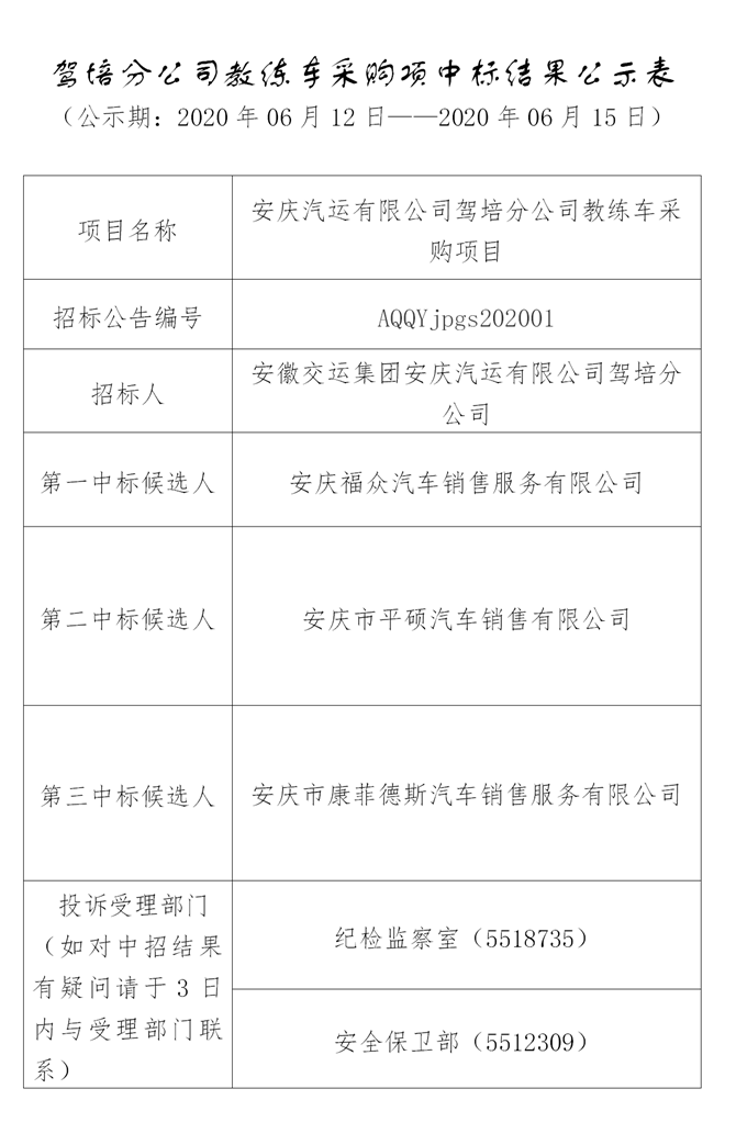 駕培分公司教練車(chē)采購項中標結果公示表