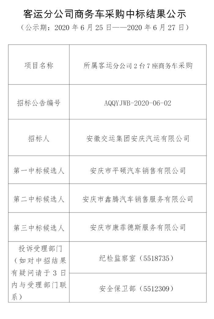 客運分公司商務(wù)車(chē)采購中標結果公示