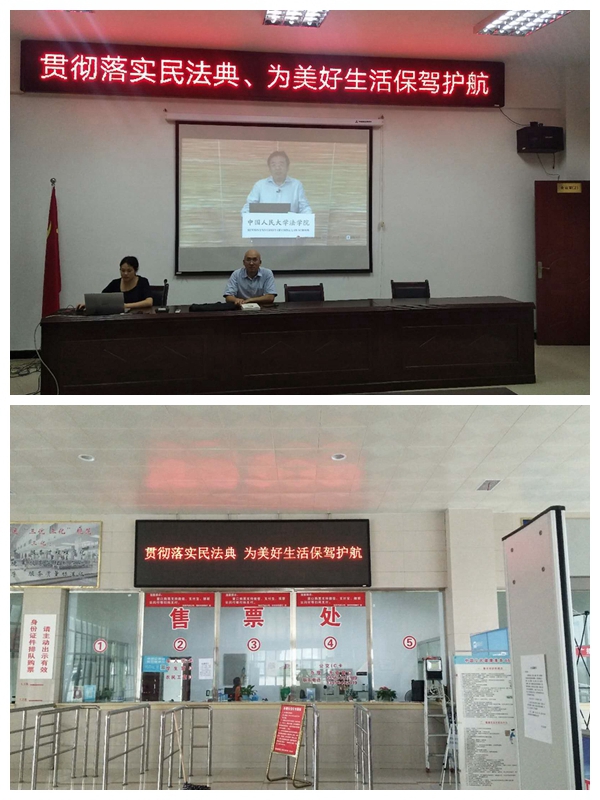 7月13日,根據上級關(guān)于積極開(kāi)展民法典宣傳通知的要求,懷寧分公司第一時(shí)間在城南汽車(chē)站候車(chē)室電子顯示屏滾動(dòng)播放民法典宣傳標語(yǔ),在廣大人民群眾中營(yíng)造學(xué)法、懂法、知法、用法的濃郁氛圍。