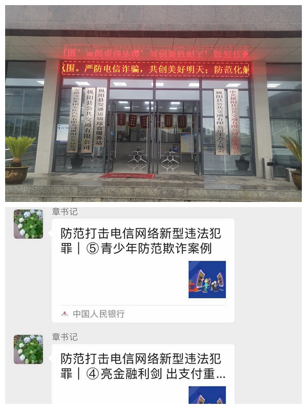 公司領(lǐng)導高度重視,精心組織,在公司電子屏和公交車(chē)尾電子屏循環(huán)播放宣傳標語(yǔ),在公司職工微信群轉發(fā)《致全市財務(wù)人員的一封信》、《致全體學(xué)生及家長(cháng)的一封信》,進(jìn)一步提高職工及廣大人民群眾對各類(lèi)電信網(wǎng)絡(luò )詐騙的自我防范意識,增強法治意識,提高維權能力,切實(shí)打擊電信網(wǎng)絡(luò )詐騙。