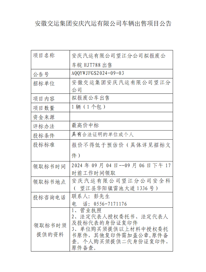 望江分公司擬報廢公車(chē)皖HJT788出售項目公告
