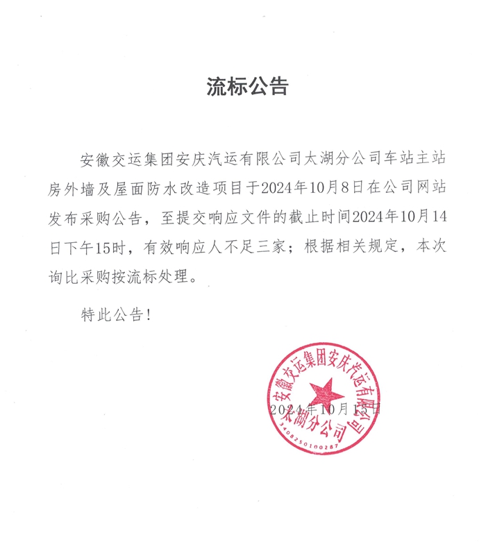 太湖分公司車(chē)站主站房外墻及屋面防水改造項目流標公告